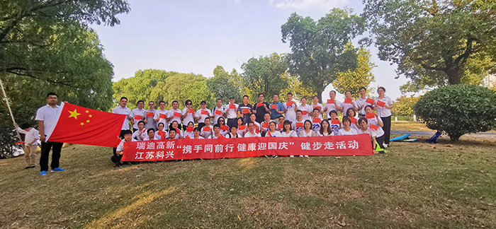 秋风和煦,暖意融融。为庆祝祖国70华诞,2019年9月30日,瑞迪高新、江苏科兴联合举办了“携手同前行,健康迎国庆”健步走活动。南科院戴济群副院长、总公司唐云清总经理、公司徐志峰董事长及两公司40多名职工参加此活动。 全体人员统一着装,从绿博园北门出发,踏着秋风,沿着绿色步道,开始了健步走活动。一路上,秋风送爽,丹桂飘香,大家欢声笑语,相互间尽情舒怀,释放工作的压力,尽情陶醉在这美景之中。 此次活动进一步激发了大家的爱国情怀,丰富了公司精神文化生活,促进了沟通,增进了友谊,增强了院科技产业部门的凝聚力和向心力。